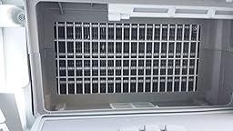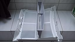 Das Gerät hat ein großes Sieb in der Türöffnung, das ist Keilförmig und kann aufgeklappt werden. Darin befinden sich 4 feine und 4 grobe Filter. Dazu noch 8 schmale Streifen mit grobem Filter. Unten ist die Klappe mit dem Wärmetauscher, der Öffnungsmechnaismus ist sehr billig konstruiert, hält aber. Wie man auf dem einen Bild sehen kann, waren ein paar Lamellen des Wärmetauschers schon angeknickt.