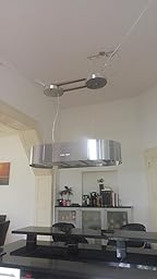 Seit einem Jahr überlegen wir, wie wir eine Dunstabzugshaube über oder an unserer Kochinsel montieren können. Dazu sollte man wissen, dass die Deckenhöhe in unserer Küche 3,8m beträgt und diese Deckenkonstruktion leicht abgehängt und nicht sonderlich tragfähig ist. Eine Montage direkt an der Decke verbietet sich somit aufgrund der Tragfähigkeit und insbesondere auch wegen des enormen Pendeleffektes bei der notwendigen Säulen- oder Seillänge. Also kam ich auf die Idee eine Verspannkonstruktion an den Wänden einzusetzen, die mir eine freihänge Montage-Plattform im Raum bietet. Durch Zufall stieß ich dann auf die für diesen Ansatz perfekt geeignete freihängende Dunstabzugshaube von Bergstroem.