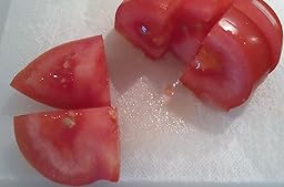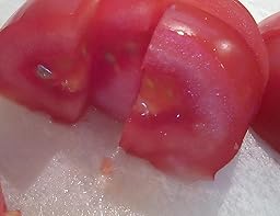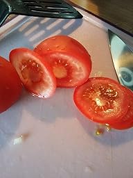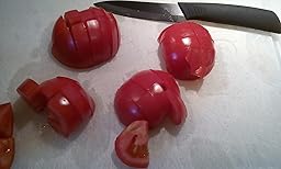 Aber das wichtigste sind natürlich die Schneideigenschaften. Der typische Test sind ja Tomaten. Ich hatte ziemlich weiche Tomaten – die Messer gingen erstklassig durch, ohne daß man dabei irgendwie drücken mußte. Also haben die Tomaten auch nicht viel Wasser verloren beim schneiden. Auf jeden Fall Schulnote 1.