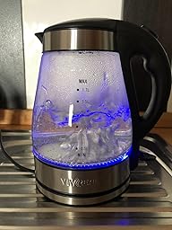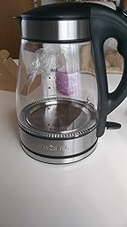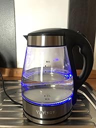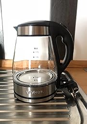 Als erstes ist natürlich zu sagen dass ein Glas Wasserkocher super aussieht. Der Wasserkocher ist wirklich sehr sehr schick. Ich finde das er auch das Wasser schnell aufgewacht. Die Füllmenge des Wasserkocher ist sehr groß, fast 2 Liter. Auch die blaue LED Beleuchtung ist äußerst stylisch und ein Hingucker. Insgesamt wirkt der Wasserkocher sehr hochwertig. Früher musste ich meine Wasserkocher nachdem sie im Gebrauch war wieder in den Schrank stellen. Ich finde das dieser Wasserkocher in der küche stehen bleiben kann. Dadurch dass der Wasserkocher sich automatisch abstellt, kann man ihn, ohne dabei zu stehen, in Betrieb setzen. Der Wasserkocher ist kinderleicht zu bedienen. Das befüllen des Wasserkocher es ist auch sehr angenehm da der Deckel auf Knopfdruck auf springt. Schön ist das das Wasser kochen jederzeit unterbrochen werden kann sei’s in dem man den Wasserkocher von der Station nimmt oder einfach den Kippschalter wieder nach oben drückt. Der Wasserkocher ist zu empfehlen. Ich finde das das Preis Leistungsverhältnis hier stimmen. Und er sieht wirklich super aus.