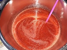 Wichtig ist, dass man das Fleisch (kalt!), Gemüse oder Obst in passende Stücke schneidet und nicht zu fest mit dem Stopfer nachdrückt. Einfach die Maschine arbeiten lassen, befüllen und nur sanft mit dem Stopfer nachschieben. Bisher habe ich alles bei Stufe 4 passend hinbekommen. Einmal bei Beerenobst zu fest nachgedrückt und das Mus ist über die Arbeitsplatte hinausgeschossen! Also nicht ungeduldig werden und langsamer arbeiten!