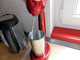 Der Mixer sieht sehr interessant aus. Oben im Kopf ist der Motor und unten ist eine größere stabile Basis. Obwohl er optisch etwas wackelig wirkt, ist er sehr stabil und steht ohne zu wackeln oder sich zu bewegen. Der Mixer ist aus Plastik und sehr sauber und gut verarbeitet. Die rote Lackierung ist sehr schön und passt super in meine Küche.