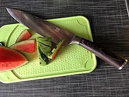 • ULTRASCHARFE KLINGE: Ultra Scharfe Klinge ist aus hochwertigem deutschem Edelstahl mit 16-18% Chrom und 0,6-0,75% Kohlenstoff. Die Klinge ist definitiv rostbeständig. Dies gibt dem Kochmesser eine glänzende und glatte Oberfläche, ideal um Fleisch oder Obst und Gemüse mühelos zu schneiden.