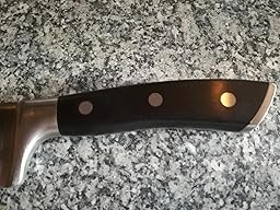 Da meine Frau schon seit längeren in den Ohren liegt und sich beschwert das ihre Messer so stumpf sind das man drauf reiten kann, habe ich nach ein tolles Messer gesucht und dieses hier gefunden. Das Messer wurde schnell und sicher verpackt verschickt und konnte auch bald von meiner Frau benutzt werden. Da sie eigentlich alles mit einem Messer schneidet, habe ich bei der Bestellung drauf geachtet das es auch so gut wie alles schneiden kann. Meine Frau hat sich extra für ihr neues Messer, Fleisch am Stück gekauft, um mit ihm Gulasch daraus zu schneiden. Sie war begeistert von der Leichtigkeit und über die scharfe klinge. Es ging durch wie Butter und sie brauchte nicht viel kraft. Das Messer liegt sehr gut in der Hand und die Klinge lässt sich sehr gut reinigen. Eine Schutzkappe für die Spitze war auch dabei. Das Messer wiegt ca 300g Gramm und die Klinge misst 17 cm. Für diesen Preis bekommt man ein sehr gut verarbeitetes Küchenmesser mit einer richtig scharfen klinge, eine Kaufempfehlung gebe ich hier gerne.