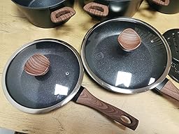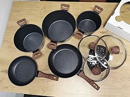 - Lieferumfang: 3 Kochtöpfe mit passendem Glasdeckel (1x 2,5L, 1x 4,1L und 1x 6,1L), 2 Bratpfannen (1x 24 und 1x 28 cm), 2 Bakelite-Matten schwarze Unterleger. Alle Griffe bestehen aus Kunststoff