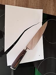 Meine “Sorgenkinder” Tomaten und Fleisch schneidet es einwandfrei,woran ich allerdings erkenne ob ein Messer gut ist, ist am Papier. Wie zu sehen, ist das Messer sehr schön durch das Papier geleitet, was mich letztendlich auch überzeugt hat.