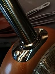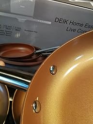 > Die Vernietungen der Edelstahlgriffe sind fast identisch zu meiner vorherigen Deik-Pfanne, bei dieser sammelt sich kein Dreck oder auch Rost in den Ritzen. Die Griffe bei diesem 3er-Set finde ich total handlich, es macht wirklich sehr viel Spaß damit zu kochen. Auch schwenken von Gemüse in den beiden kleineren Pfannen klappt wegen den breiten Griffen sehr gut. Wenn man eine Koch-Insel oder viele Haken an der Wand hat kann man die 3 Pfannen einfach dort aufhängen. Alle 3 Pfannen stehen bei mir bündig auf dem Herd und wackeln nicht, die “Gold- glänzende” Beschichtung ist gleichmäßig aufgetragen und es gibt keine beschädigten Stellen. Der Rand ist nicht scharfkantig, eignet sich aber dennoch zum ablegen von Kunststoff-Wendern oder Schöpflöffeln.