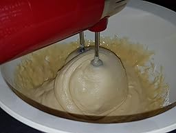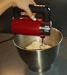Beim Auspacken wird klar, er sieht wie auf den Bildern verdammt gut aus. Der rote Mixflitzer ist etwas schwerer als meine anderen Handmixer, aber mit dem Ergonomischen Soft-Touch-Griff liegt er trotzdem gut in der Hand. Enttäuscht bin ich von der, für mich, viel zu kurzen Kabellänge von ca.117cm. Neu für mich ist der An/Ausknopf der beim Einschalten rot blinkt, gefällt mir sehr gut. Darüber der riesen Knopf zum Knet-/Rührhaken auswerfen. Darunter die + und – Tasten, um den Mixer in Gang zu bringen bzw. die Geschwindigkeit zu regeln. Mit seinen 500 Watt und 4 Geschwindigkeitsstufen samt Turbofunktion, indem man die + Taste gedrückt hält, rührt und knetet der rote Flitzer sauber und schnell.