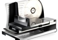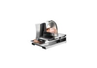 Silber/Anthrazit 130 Watt, 230 V~, 50 Hz Vollmetall-Allesschneider mit freischwebender Konstruktion. Gehäuse, Boden-, Anschlagplatte und Schlitten aus Aluminium. Messer mit Spezialschliff, 18,5 cm Ø, aus rostfreiem Solinger-Edelstahl. Stufenlose Verstellung der Schnittstärke. Sicherheits-Permanent- und Momentschalter mit Kindersicherung. Abnehmbarer Restehalter mit Fingerschutz. Sicherheitsschlüssel für leichtes Entnehmen des Messers zum Reinigen oder Wechseln Unold 78816 Allesschneider PROFI mit… Read More »