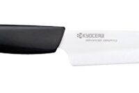 Die Keramikmesser von Kyocera begeistern mit ihrer Leichtigkeit und extrem langen Schnitthaltigkeit. Dieses Universalmesser bietet eine weiße Klinge aus Zirkoniakeramik. Durch die Abrundung ist die Spitze weniger anfällig vor einem Abbrechen. Der schwarze Kunststoffgriff liegt mit seiner ergonomischen Form gut in der Hand. Grifflänge 11 cm, Klingenlänge 11,5 cm, Gewicht 50 Gramm mit Keramikklinge Kunststoffgriff… Read More »