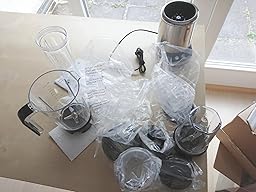 • Inhalt: 1x Standmixer, 1x 1,2-l-Mixkrug, 2x To-go-Mixflaschen, 1x kleiner Mixbehälter (Kunststoff), austauschbare 6-flüglige Kreuzklinge und Flachklinge