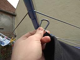 Außerdem ist die Öffnung der Kordel gegenüber vom Karabinerhaken angebracht – was nicht wirklich durchdacht ist. Denn dadurch hängt der Beutel so schräg, dass die Klammern die Kordel aufdrücken und herausfallen. Vor allem dann, wenn man noch am Aufhängen ist und immerzu in den eigentlich offenen Beutel greifen muss. (siehe Foto)